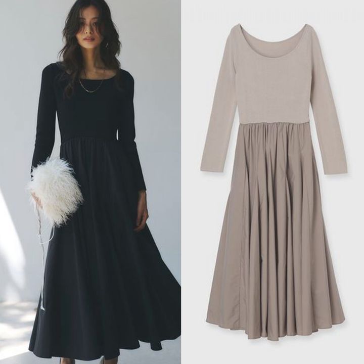 程よい厚みのあるニット素材のトップスと高級感のあるタフタのスカートをドッキングさせた、美シルエットワンピース。デコルテが綺麗に見えるカットなのも嬉しい。ニットドッキングフレアワンピース/アニュアンス