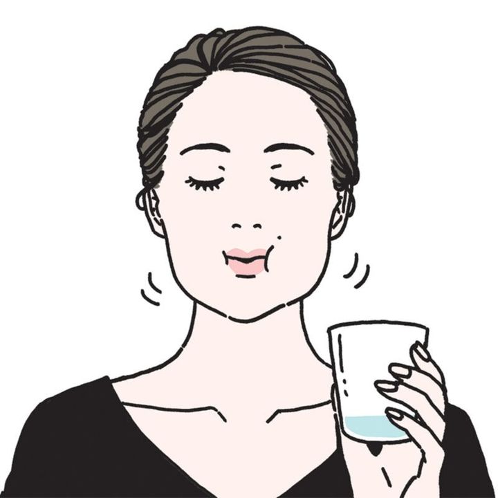 おちょこ1杯分(約20ml)の水を口に含み、口内をドラム式洗濯機に見立ててゆすぎます。まず右回りに3〜4回ゆすぎ、同様に左回りに3〜4回。水を捨てて新しく同量の水を含み、10秒を目安に、左右交互に水を移動させるようにゆすぎます。同様に水を替え、舌を上あごにつけ、たたき洗いをするイメージでゆすぎます。こうすることで口内をきれいにしつつ、口まわりの筋肉が鍛えられます。