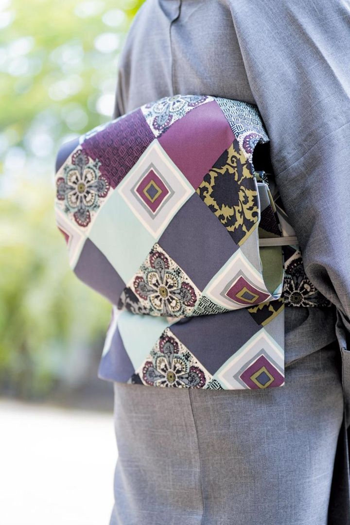 「パッチワークのような更紗柄の帯は、グレーや黒、モスグリーンなど渋い色の着物に合わせやすく、重宝」