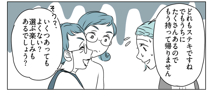 すると、私たちのやりとりを見ていた義叔母が入ってきました。義母は義叔母にもバッグを勧めていますが、義叔母は「要らない、使わないもの」とバッサリ。