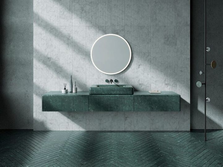 エリザ・オッシノがギリシャ神話に登場する海の女神、ネレイドをイメージしてデザインしたコレクション。長きにわたり雨や水にさらされ浸食された天然石を思わせる彫刻を施した。石質は7種類から選択可能、ドロワー正面の部材は木質も選べる。