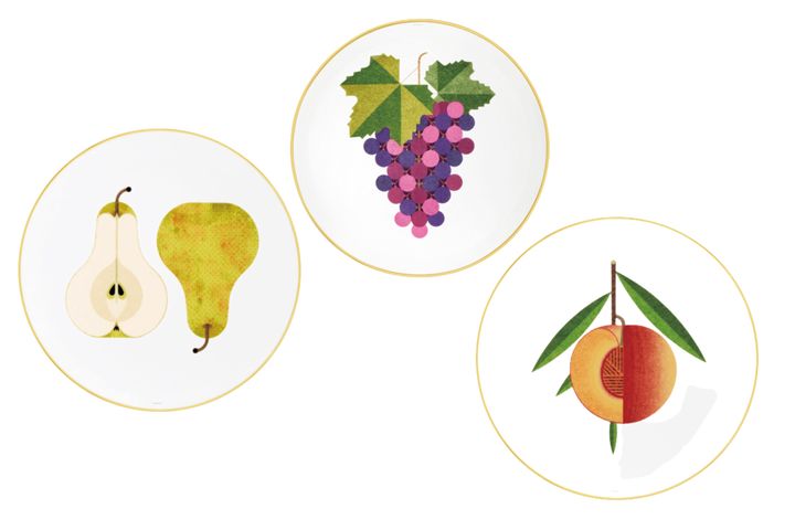 日本人イラストレーターの武政諒が、オレンジやサクランボ、ザクロといった果実を白いポーセリンに描いた美しいテーブルウェア。コンパスや定規を用いて描いた輪郭と、果肉のみずみずしさを捉えたディテールのコントラストが秀逸。縁を輝かせる金の彩りがアクセントに。