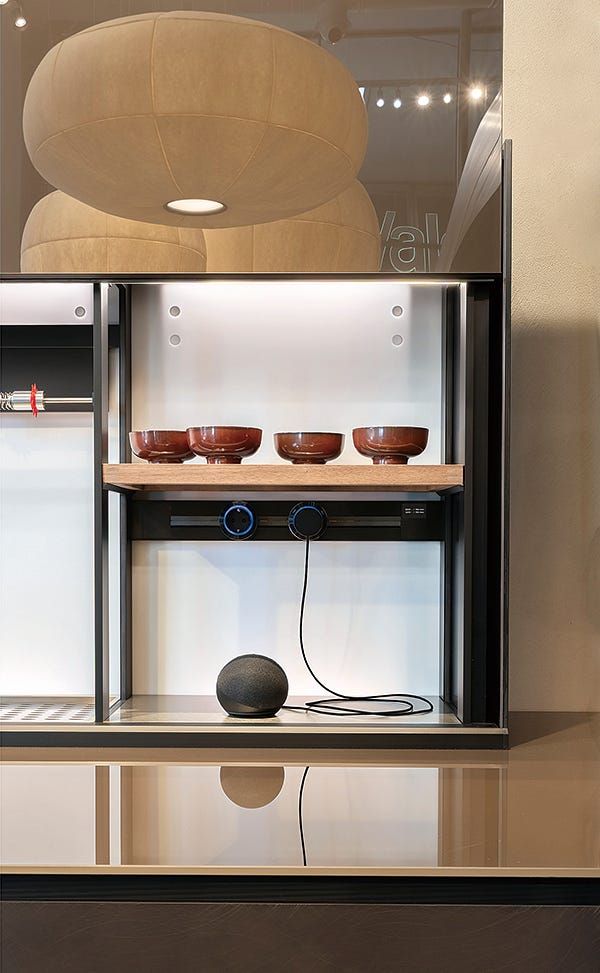 軽く触れる動作やリモコン、アプリ、音声によって、扉や水栓の操作が可能になった、特許を取得したシステム。バックパネルの照明は、同じ操作で暖色から寒色まで、さまざまな光の色のグラデーションに加え、火、大地、水、空気から着想を得た色にも設定することが可能。