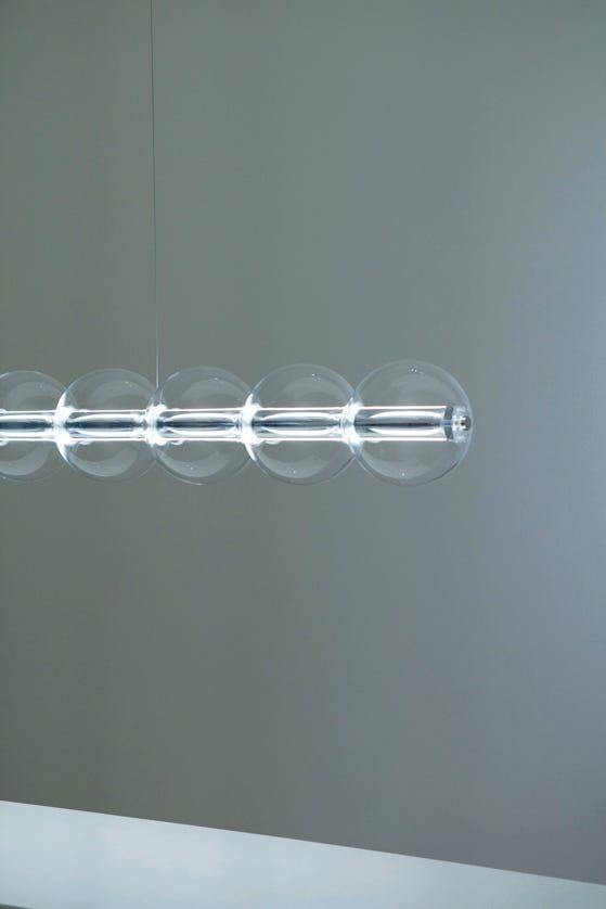 円筒形のアルミニウム製のボディを、シャボン玉や雨粒を連想させる吹きガラスに通したモジュールタイプのLED照明。照度の調節は本体の端をタッチして行う。デザイナーのロナン・ブルレックは、工業的技術と詩的なデザインを融合。洗練されたフォルムと幻想的な光を実現した。
