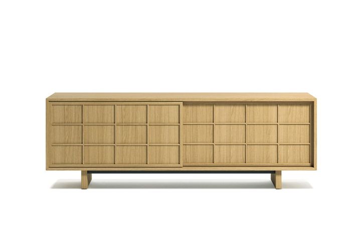 “固定観念を取り払う”という視点から考案されたキャビネット。デザインした北川大輔は、収納家具の重要な要素、“取っ手”をなくすことに新たなデザインの可能性を見いだした。格子の持つ構造と意匠、人の無意識の行為の関係性に着眼。扉は木材のほかガラスとファブリックも選択肢に。