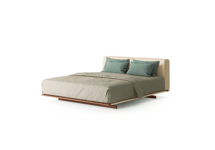 無垢材のベースパネルの上にマットレスをのせたベッド。マットレスより広いベース部分と、内側に設置された脚部のデザインが相まって、宙に浮かぶような浮遊感が強調された。デザインはガムフラテージ。ヘッドボードはレザーやファブリックが選べる。