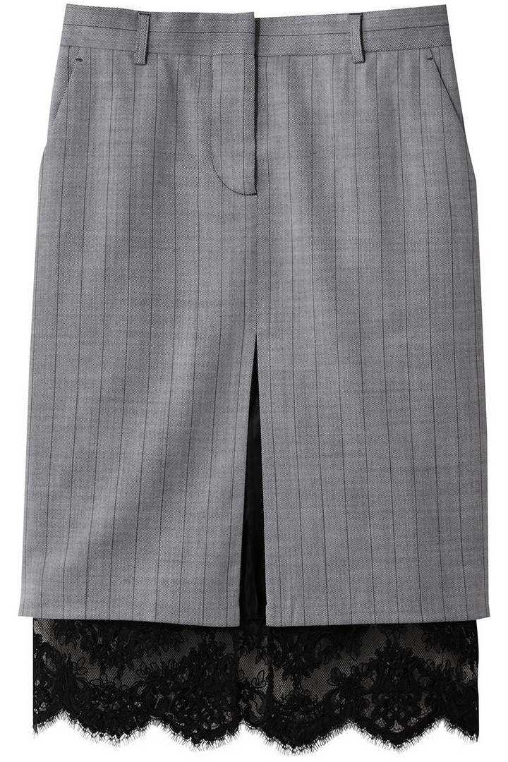 「今季の『ステラ マッカートニー』に見られる、強さと美しさを兼ね備えたパワフルな女性像にぐっときました。オフィススタイル風のグレーストライプに、センシュアルなブラックレースが組み合わさったミディ丈スカートは、まさに今のムードを体現する一着」