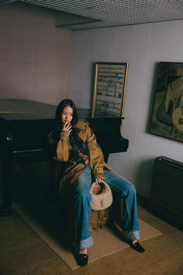 「イカリーノ」バッグ(16×22×7.5cm)445,500円、コート 693,000円、ブラウス 385,000円、デニムパンツ 160,600円、リング 52,800円、パンプス 214,500円/以上サンローラン バイアンソニー ヴァカレロ(サンローラン クライアントサービス)