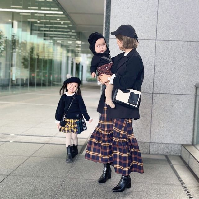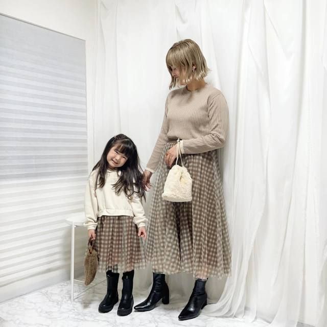 次にご紹介するのは、ボトムスをお揃いにして楽しむ親子リンクコーデ。冬らしい色や柄を取り入れてお揃いにすると、親子で可愛いコーデが楽しめます。女の子の場合は、冬らしさを演出できるチェックスカートが特におすすめ! 同じ柄でなくても、チェック柄の雰囲気や色合いを揃えるだけでリンク感が出ますよ。