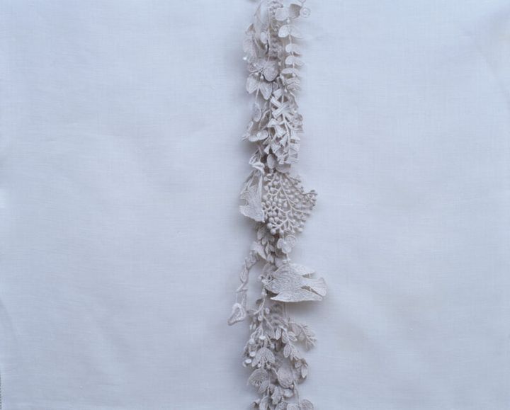 37ピースもの刺繍が織りなすparade(パレード)は、レース工場で平面の布地に刺繍を行ったあと、支持体となる布を溶解することによって、その姿を表す。