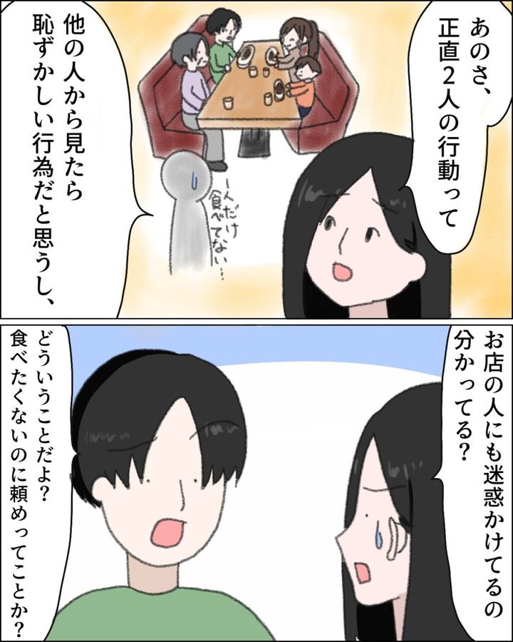 「正直2人の行動って他の人から見たら恥ずかしい行為だし、お店の人にも迷惑かけてるの分かってる?」マリちゃんは私と同じ考えだったようで、義母とヒロユキの行動を非難します。しかし、ヒロユキはまだ理解できないのか「どういうことだよ?食べたくないのに頼めってことか?」と的外れな返答をしました。