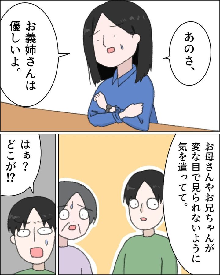 目を丸くして驚く2人をよそに、マリちゃんは続けます。「お義姉さんは優しいよ、お母さんやお兄ちゃんが変な目で見られないように気を遣ってて」すると、ヒロユキは怪訝な顔をして「はぁ?どこが!?」と言いました。