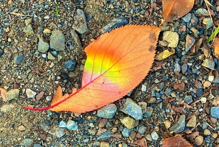 子「みて!虹の葉っぱ!!」→思わず二度見!本当に虹色に光っていた落ち葉がすごい