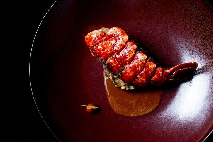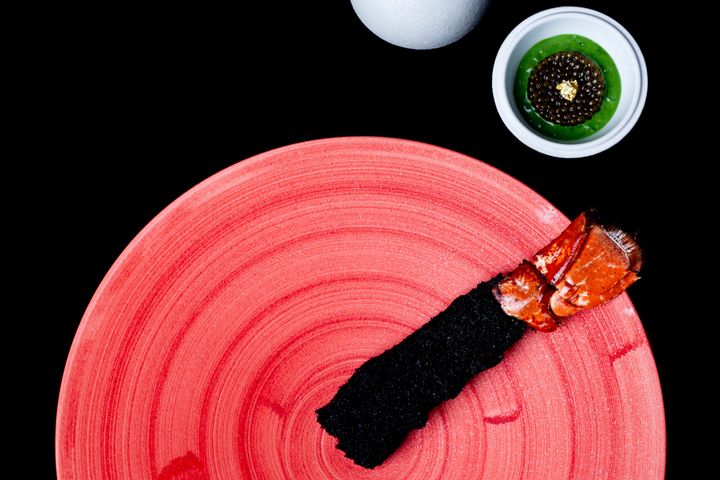 仏ノルマンディー産のオマールブルーをバターでゆっくりと調理した後に藁で香りを纏わせ高温で仕上げた「オマールブルーのフュメ キノコのフリカッセ ソースオマールディーヌ」か、真っ黒な竹炭入りの衣を纏ったアートピースのようなオマールブルーのエビフライにキャビアを添えた「オマールブルー海老フライ キャビア ソースグリビッシュ」(+¥3,000)から選ぶことができます。