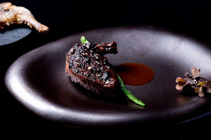 メインは仔鳩を炭火で皮目を香ばしく焼き上げてから味噌を塗り、高温で表面を炙るように焼き上げた「仏 ランド産 仔鳩のロティ 味噌のコンディモン」か、マリネしてゆっくりと温度を上げて調理したフィレ肉を、最後に高温の炭火で表面をカリッと香ばしく焼き上げた「熊本県産 あか牛 フィレ 炭火焼き」(+¥3,000)からセレクトできます。