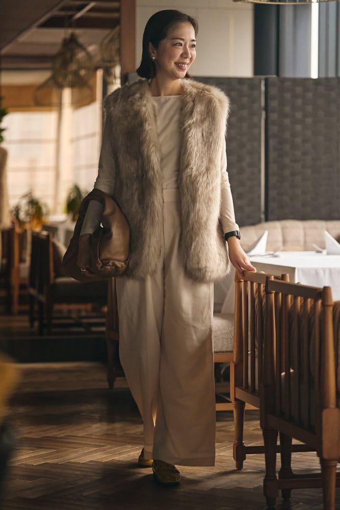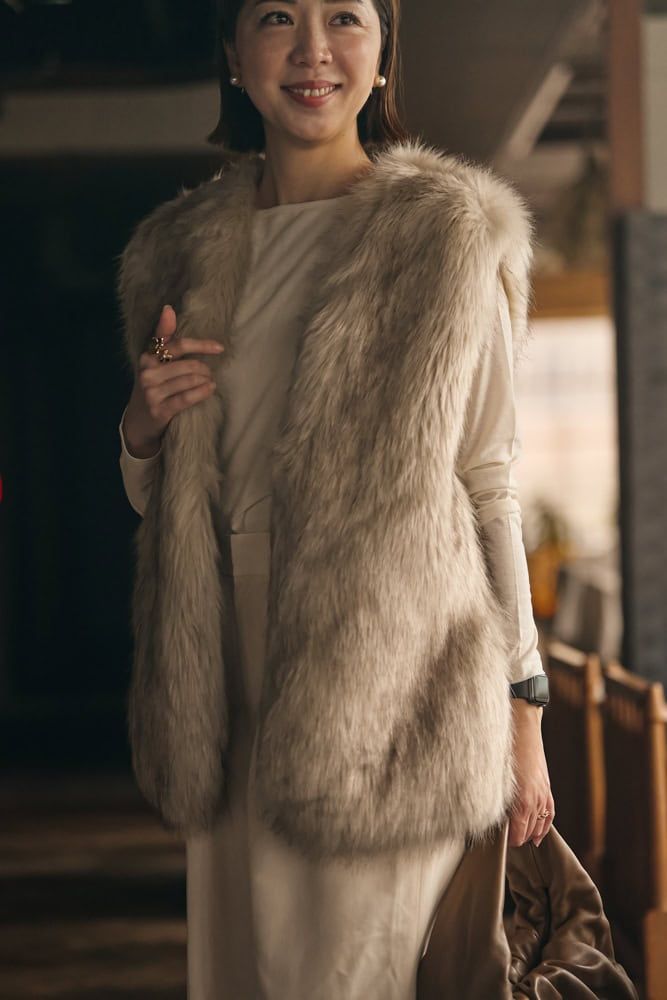 照明がダウンしたレストランなどの会場では、かすかな光の中でどう見せるかが勝負。存在感を出せるようにホワイトコーデにまとめました。1枚で着映える毛足の長いファージレは冬の街でも暖かく、ナイトアウトの高揚感をより盛り上げてくれるパーティの鉄板アイテムです。