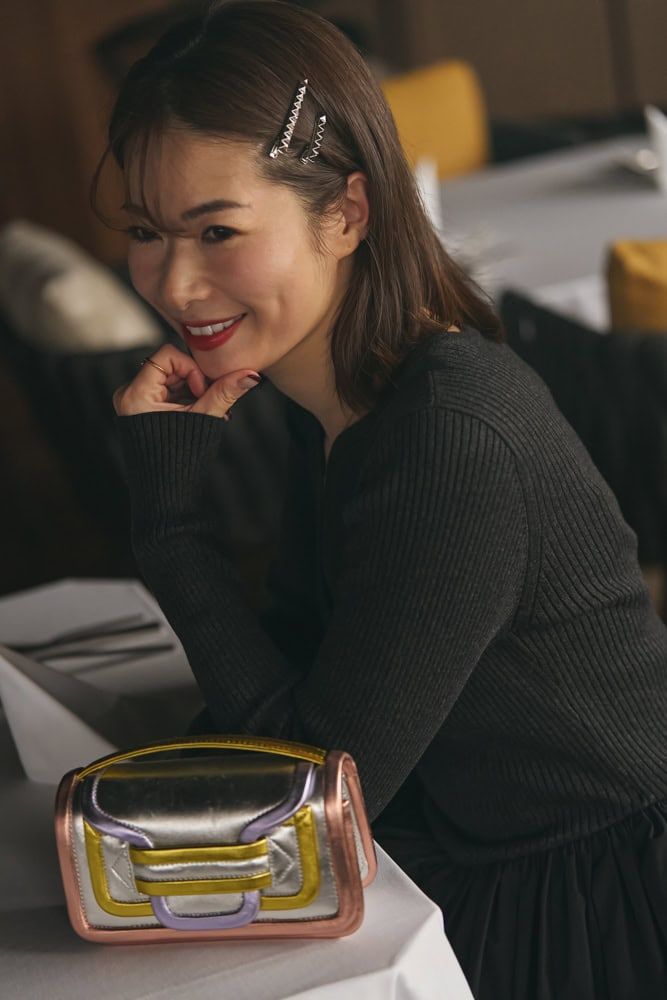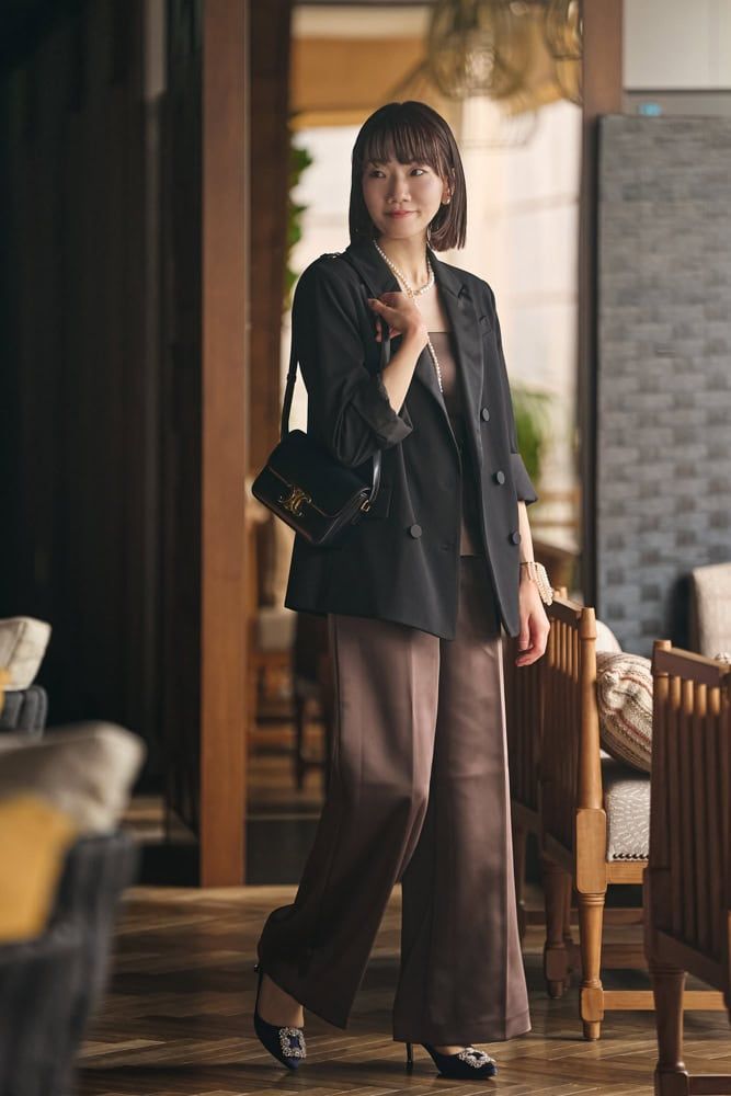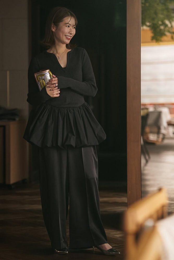 「甘すぎない」が今年のテーマでもあったので、パンツスタイルに。思いきりワイドなサテンパンツでハンサムに華やぎつつ、トップスがシンプルすぎると自分らしさがなくなってしまうので、ペプラム型のふんわりトップスを合わせました。小物はシルバーで統一して、ガチャガチャにならないように纏めました。