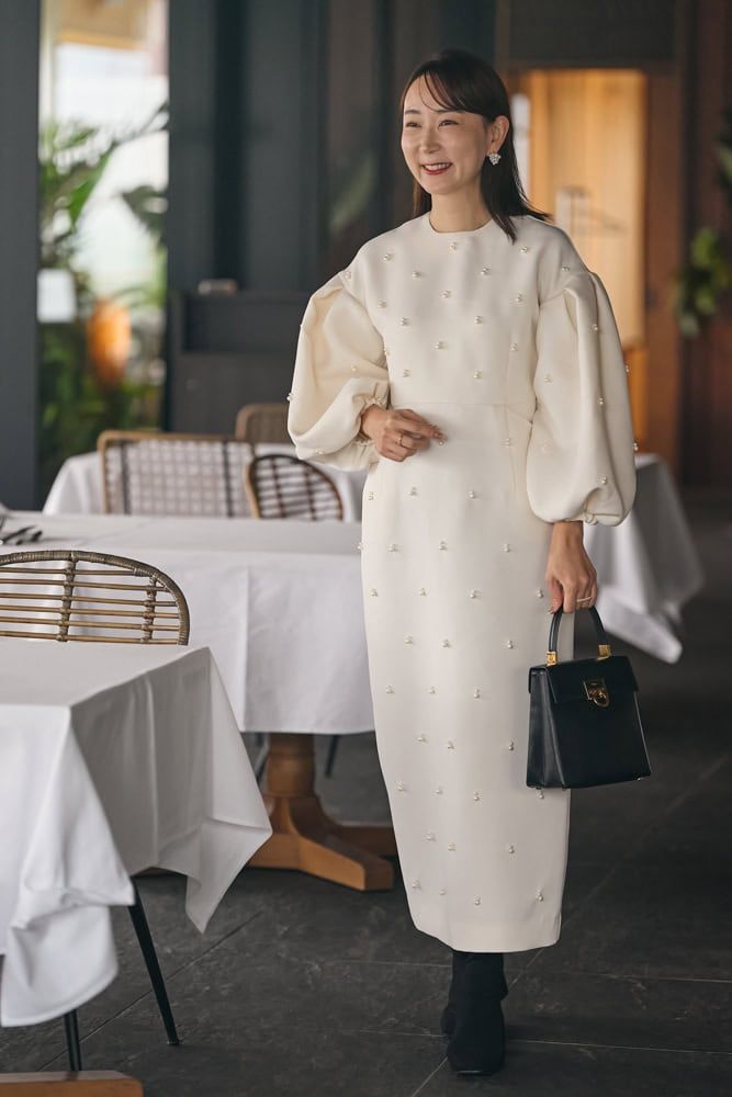 真っ白のワンピースはIラインのすっきりしたシルエットと、たっぷり袖のボリューム感、そのメリハリが華奢見えのポイント。散りばめられたパールが立体感をつくり一枚着るだけで華やげます。きれいに見える要素がたくさん詰まった大人のホワイトコーデです。
