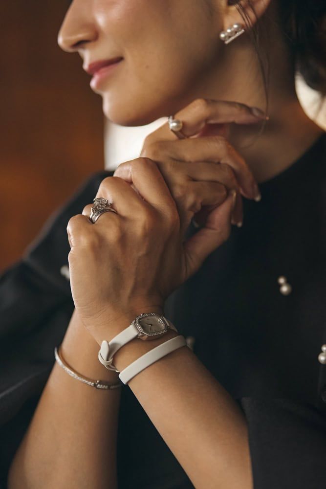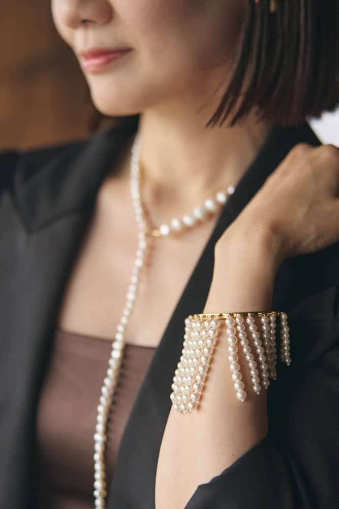 毎年クリスマスシーズンに向けてドレスワンピをお迎えしています。今年はツルの展示会で出会ったこちらのパール付きワンピースに。一年に一度のホリデーシーズンは思いっきり楽しみたいので、ジュエリーもいつもよりクラスアップして、ワンピースに合わせたパールや石付きを選んでコンサバモードに振り切ります。