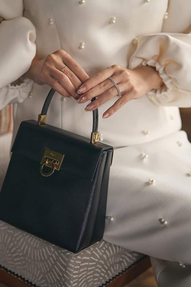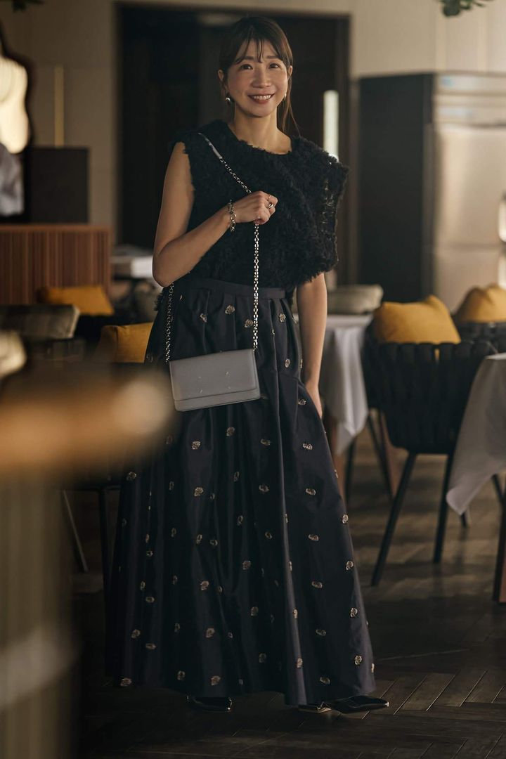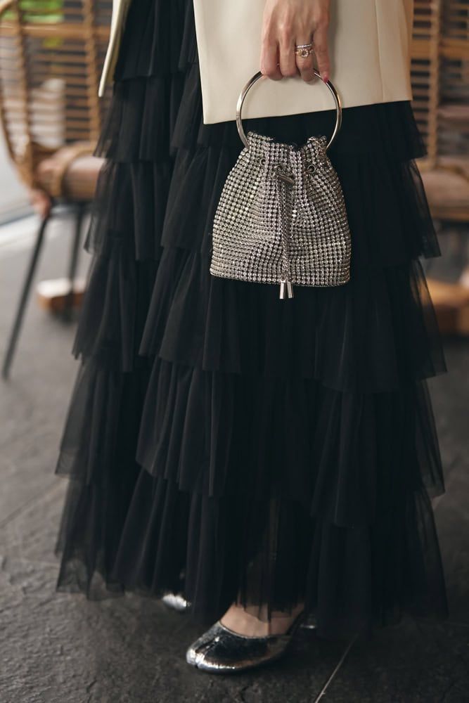 広がりすぎないシルエットが気に入っているティアードスカートは普段から愛用している1枚。タキシード風の白ジャケットを合わせてパーティ仕様に。ラインストーンがちりばめられたミニバッグは持つだけで即映えるのでパーティコーデに欠かせないアイテムです。