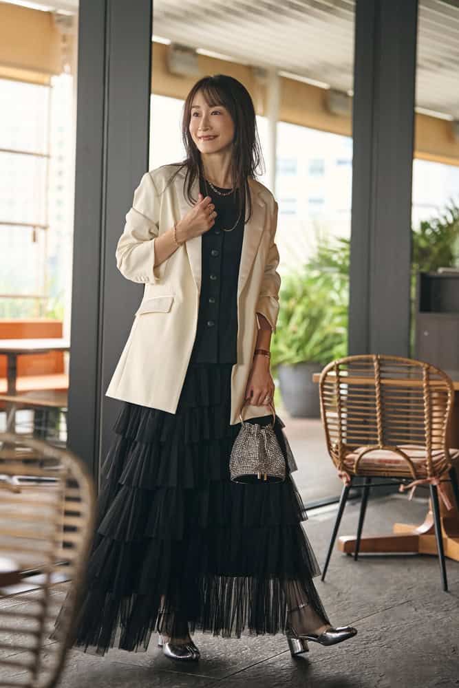 甘めティアードスカートは白ジャケットでクールに寄せて