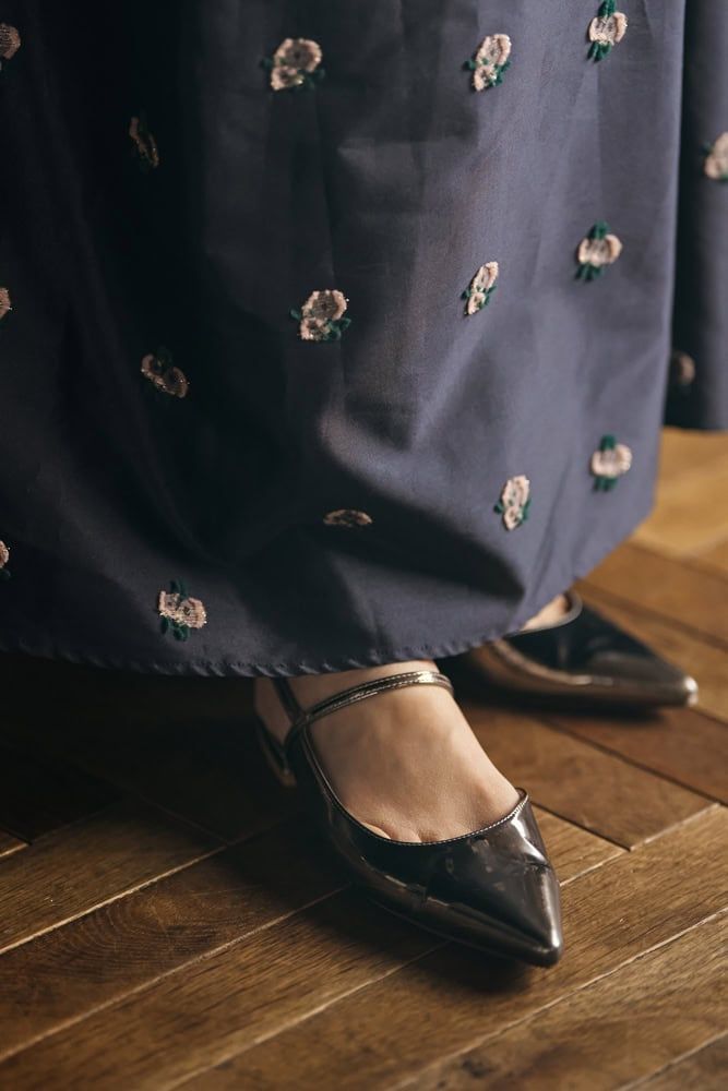 チュールの素材感が表情あるトップスと光沢ある生地に立体感のある刺繍が映えるスカートで、程よい華やかさを出しました。上下とも凝ったアイテムですがオールブラックなのでシックに纏まります。ダークトーンでものっぺりしない奥行きのある大人のコーデを目指しました!