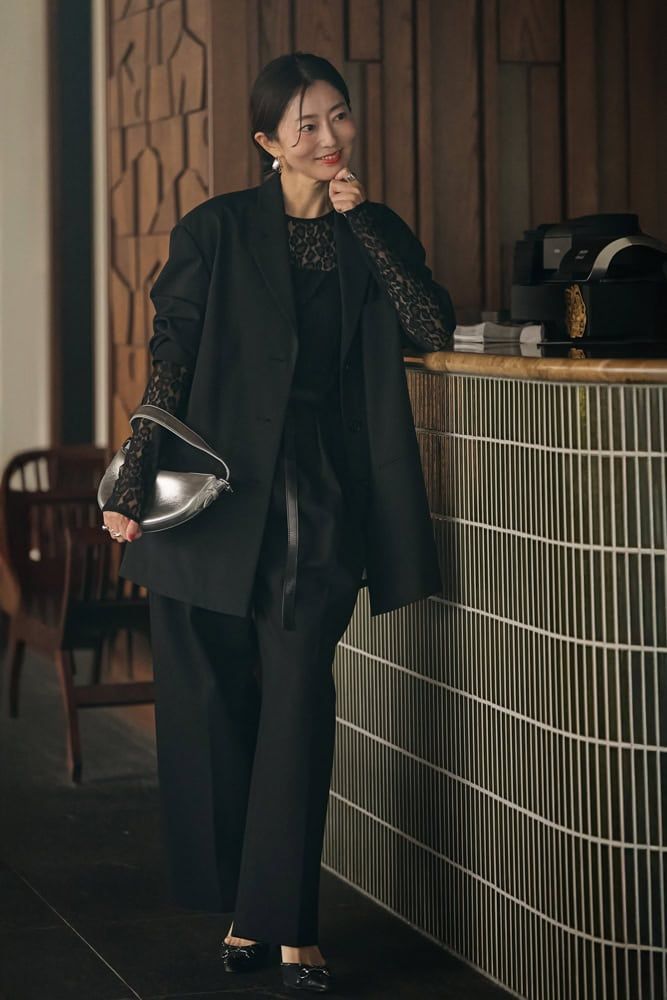 オーバーサイズなジャケットに太めのワイドパンツ、メンズライクなアイテムをメインに、インナーにはZARAのアニマル柄のシースルートップスを合わせてフェミニンさをプラスしてみました。ZARAにはパーティアイテムが豊富なのでシーズン前にチェックします。ヘアはきっちりまとめずルーズに仕上げて大人っぽい抜け感を。