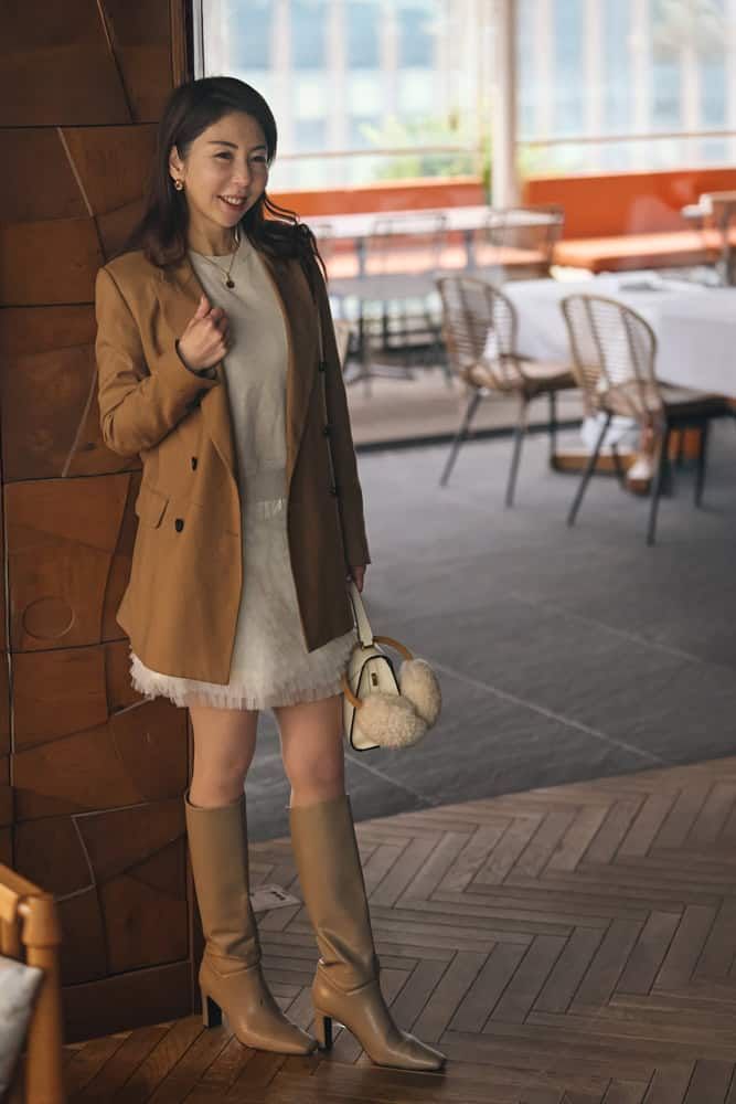 冬のパーティは黒に頼って暗い店内で沈みがちなので、着るだけで華やかになる白やベージュでレフ版効果を狙います。白ニットは汚れがない清潔感が一番大事だと思うので、こまめに買い換えられるプチプラで。ミニスカコーデが甘すぎにならないようにジャケットで引き締めました。同じくプチプラの耳当てで遊びゴコロを!