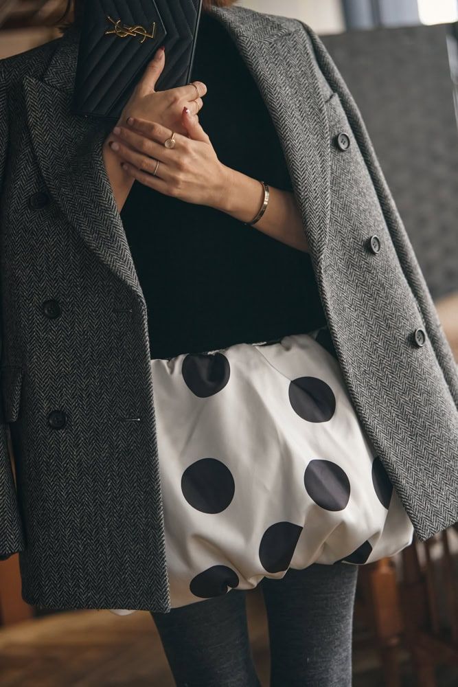 door to doorのパーティでは思いっきりキャッチーなコーデで非日常を楽しみたい。トレンド感たっぷりなバルーンスカートはZARAとDisneyの夢のコラボ♡かっちりした雰囲気のオーバーサイズジャケットとモノトーンで纏めて、遊びゴコロと大人っぽさのバランスを調整しました。