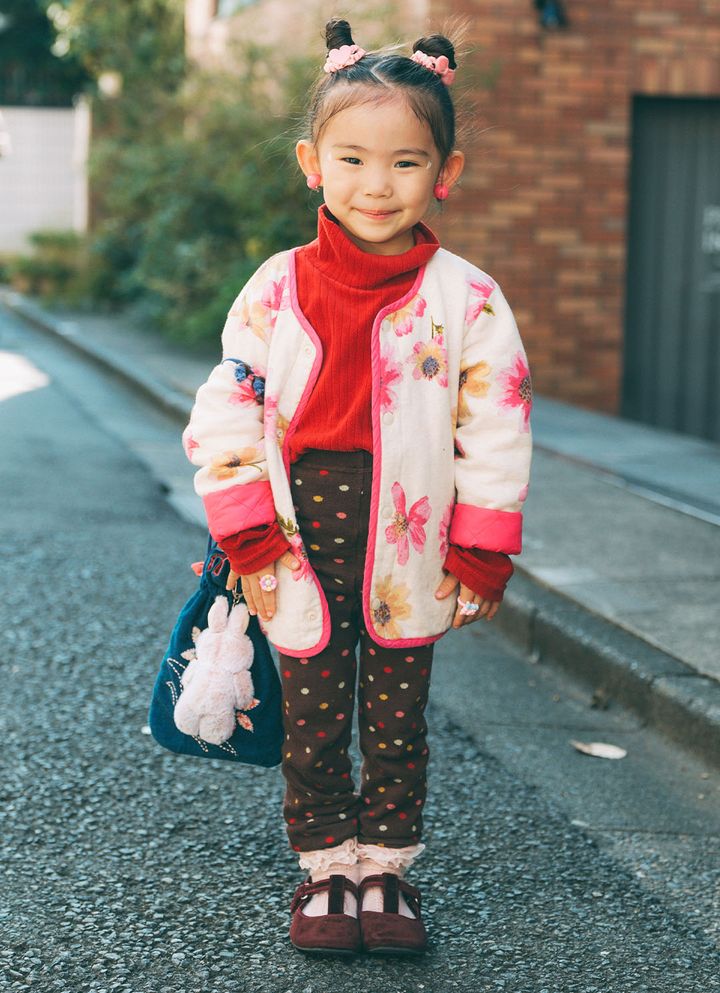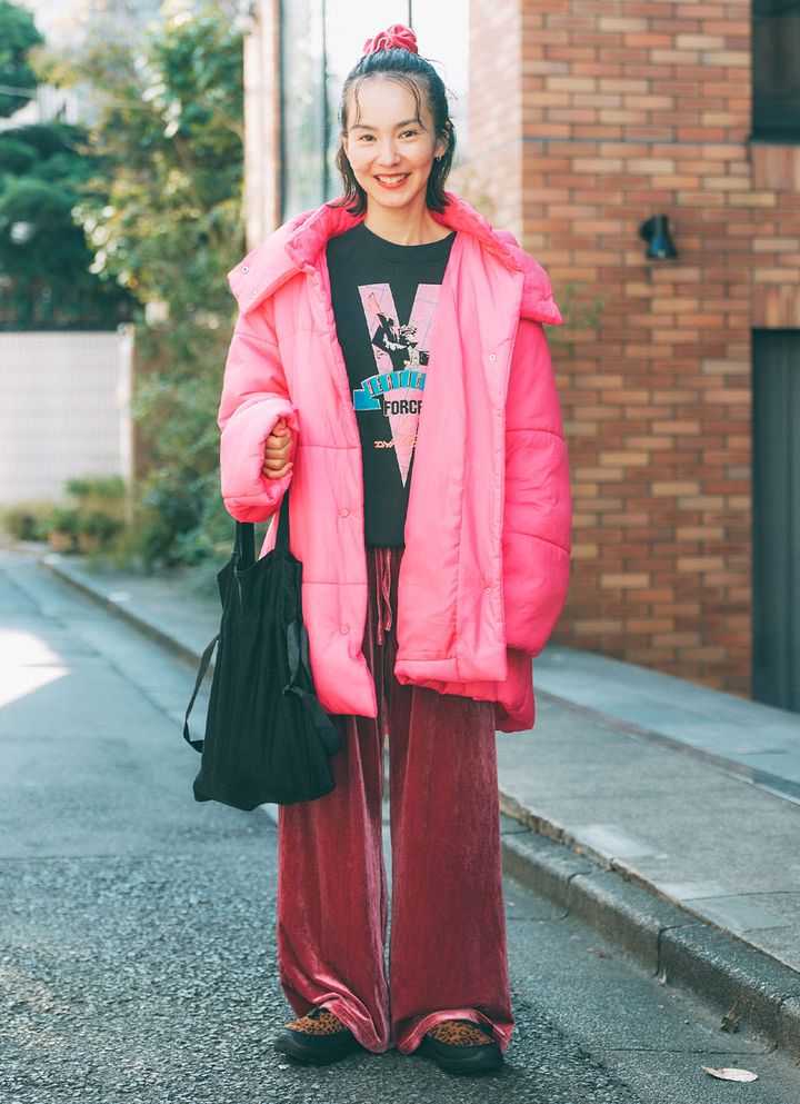 ママのキャッチーなダウンコートを筆頭に、みんなでハッピーピンクをシェアして、寒い冬も楽しいファミリーコーデの出来上がり! キッズの顔周りのアレンジや子ども心をくすぐるアイテムチョイスは、ぜひヒントにしたいところ。