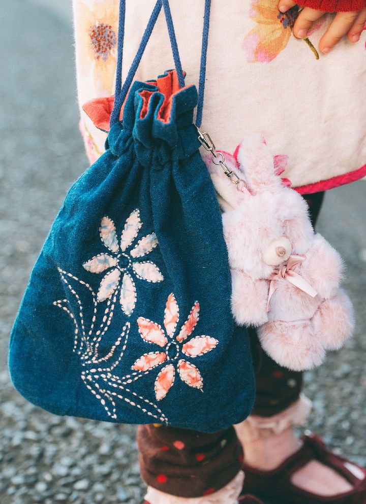お花の刺しゅう入り巾着バッグはクラフト感がたまらないアイテム。ウサギのビッグチャームと一緒にお出かけを楽しもう♪