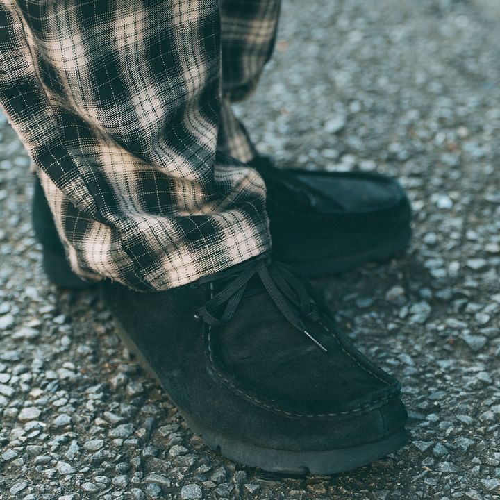 『クラークス』のブラックシューズでコーデを落ち着かせて。チェック柄ボトムスとスウェードで、冬らしさ満点な足元に昇華!