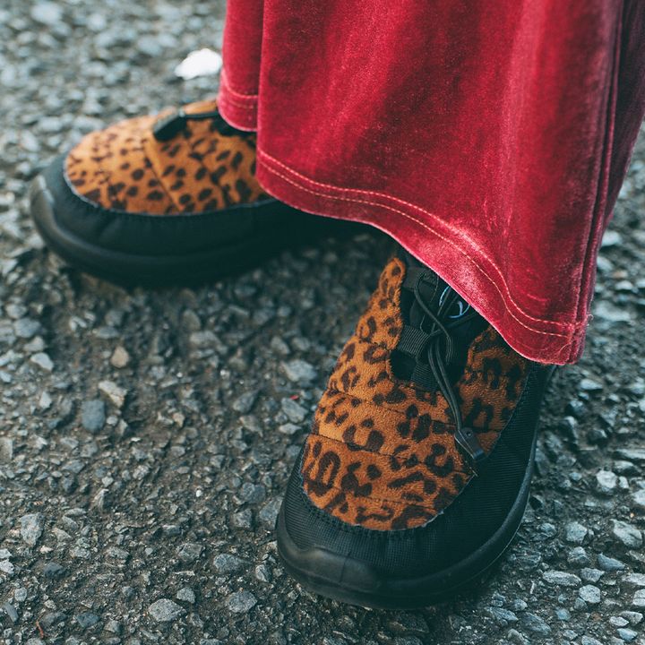 足元はスパイシーなレオパード柄スリッポンをオン!キルティングとドローコードが、装いにスポーティさを添えてくれる一足。