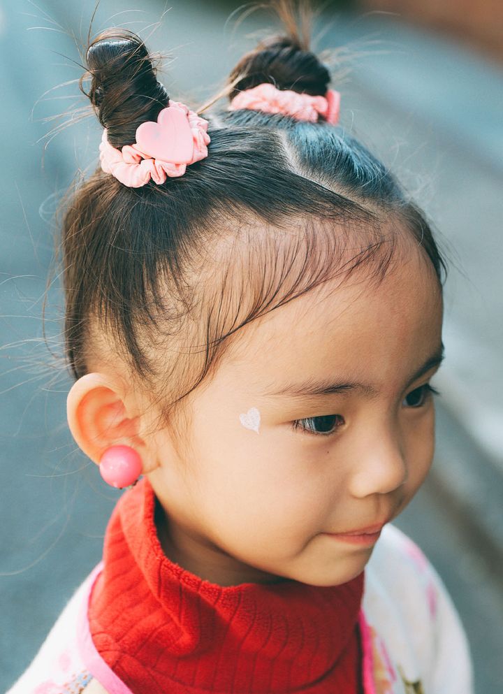 ふたつのお団子にピンクのヘアアクセサリーが映えるヘアスタイル。顔まわりのハートシールもキュートにイヤリングを付けて、キッズのテンションアップ♪