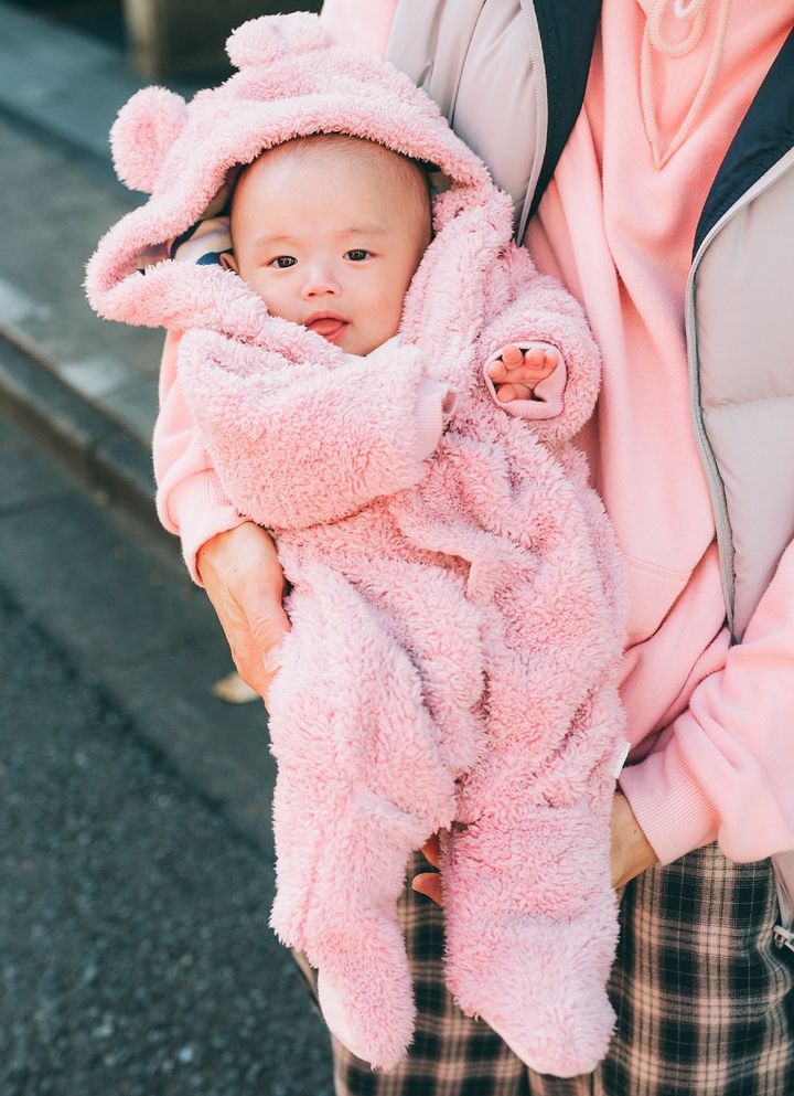 もこもこの『コンビミニ』クマ耳オーバーオールがあたたかそうなコーデ。インパクトのあるデザインもいけちゃうのはベビー期ならでは。