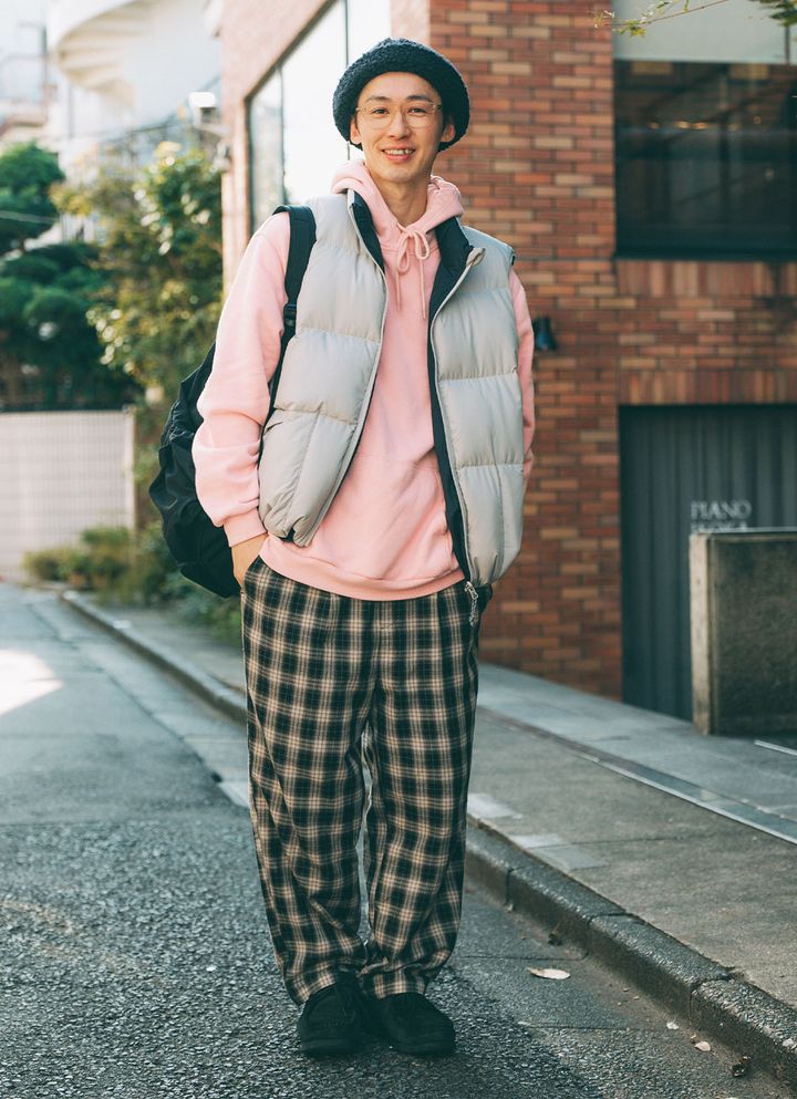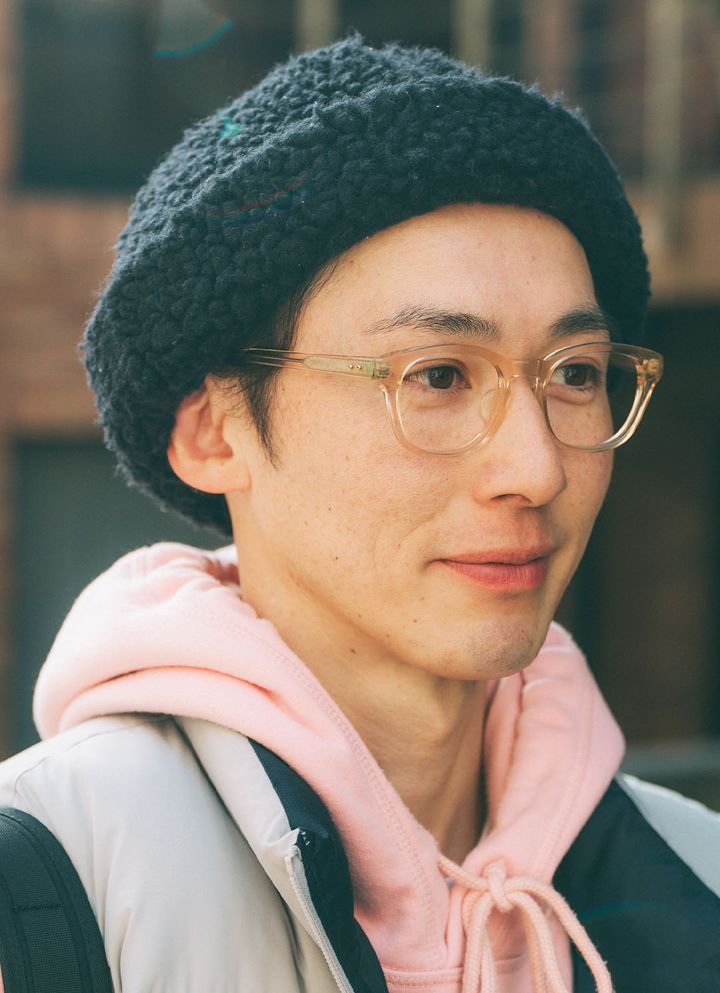 『ビームスボーイ』のニット帽はシルエットがなんともキュート! キリっとしたクリアフレームのメガネで、メリハリを付けたのがポイント。