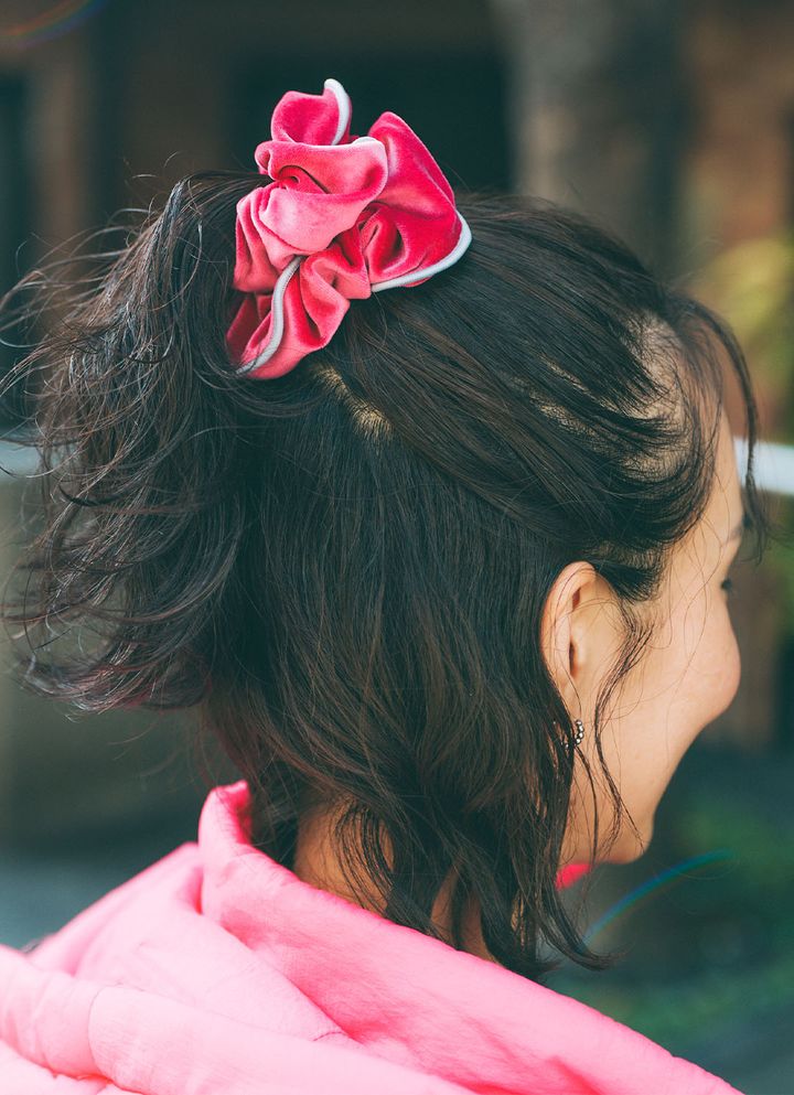 『スリーコインズ』のシュシュもピンクに決めて、とことん揃えたワンカラーコーデの完成! 動きのあるハーフアップスタイルで、のっぺり感を回避したのもグッド。
