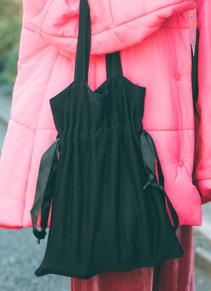 ブラックのトートバッグが引き締め役に抜擢! 巾着デザインで遊ぶ心をプラスしたのも見逃せない。