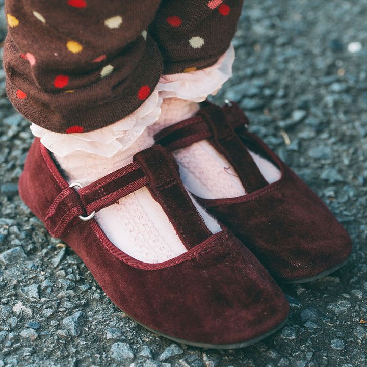 上品なベロアシューズにフリルソックスを繋ぎ役にセレクト。ロマンティックムード漂うコーデにクラスアップ!