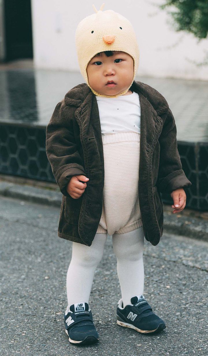 NAME:kikiちゃん・1歳思わずにやけてしまうほど可愛い、ひよこのビーニーをかぶったkikiちゃん。トップス、ボトム、タイツをオールホワイトで統一し、ブラウンのアウターを重ねて今っぽいコントラストをプラス。厚手のコーデュロイ素材が、防寒はもちろんウィンタームードも高めてくれる。item▼