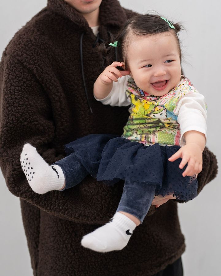 NAME:きりちゃん・0歳満面の笑みで写真を撮らせてくれたきりちゃんは、独創的なプリントが人気の『ムチャチャ』のトップスを愛用。ボトムは、ネイビーのレギンスにふんわりとしたチュールのスカートをレイヤードして旬なムードをオン。足元は『ナイキ』のロゴを目立たせて、イマドキのスポーツミックスコーデに。item▼