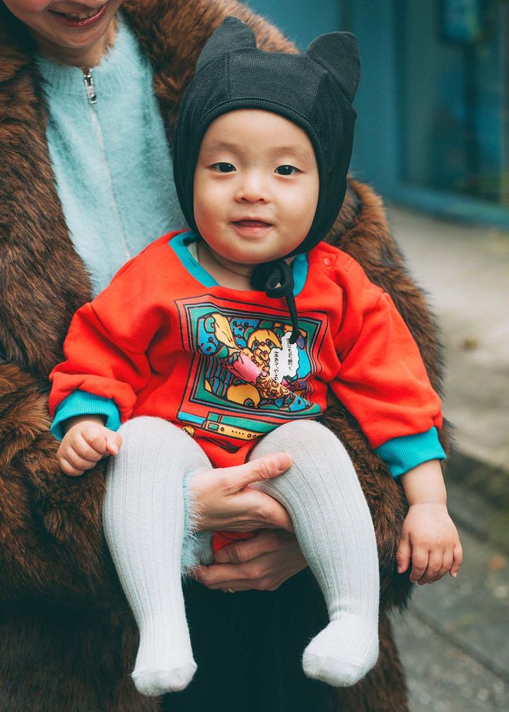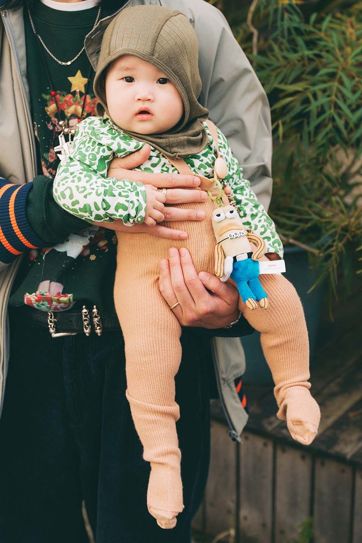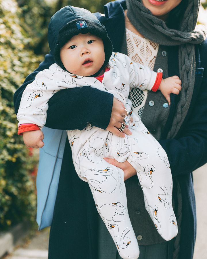 NAME:息子くん・0歳オーガニックコットンを使ったイギリス生まれのブランド、『スリーピー ドー』のスワン柄ロンパースがお気に入りの息子くん。全面にプリントされた白鳥が、可愛さと遊び心を引き立て、着るだけで主役級の存在感に。仕上げに『ポーラン・オ・ピレット』のフリース素材のハットをオンして、冬のお出かけもぬくぬく。item▼