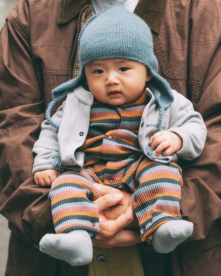 NAME:ぶんたくん・0歳おしゃれ心を刺激するニュアンスカラーのマルチストライプのロンパースがお似合いなぶんたくん。そこに、『モンベル』のスタジャンでちょっぴりレトロなエッセンスをプラス。ロンパース、スタジャン、ビーニーをくすみカラーで揃えることで、やさしくまとまりのある雰囲気に。item▼