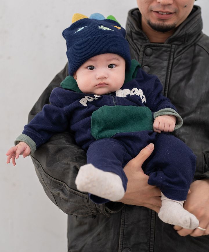 NAME:りおくん・0歳ヴィンテージショップで購入したネイビー×グリーンのバイカラーフリースでポカポカ気分のりおくん。恐竜の3Dのディテールと刺しゅうが施されたビーニーをちょこんとかぶって遊び心たっぷり。全体をネイビーでまとめるだけで、統一感が生まれおしゃれ度もぐんとアップ!item▼
