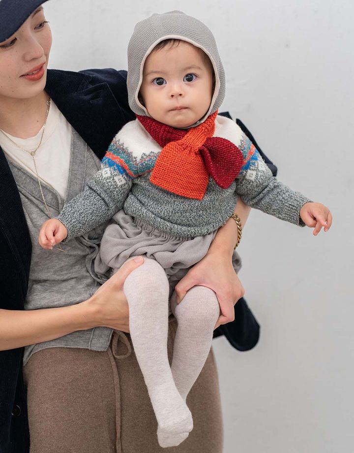 NAME:キナリちゃん・1歳背筋をピンッと伸ばしたまま、ママに抱っこされる姿がとってもお上品なキナリちゃん。冬ならではのノルディック柄ニットに、ボトムとボンネットをグレーで統一して、やわらかなワントーンに。仕上げに、オレンジ×赤のバイカラーストールをひと巻きすることで、パッと華やぐ冬のおしゃれコーデが完成。item▼
