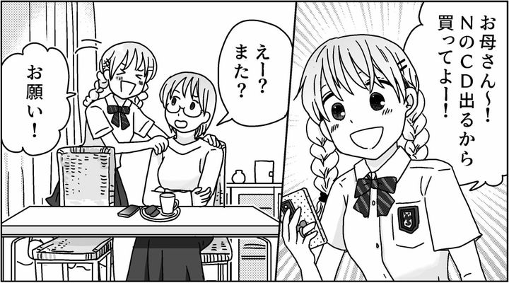 これは数年前のお話です。私(ルミ、40代)は夫(スグル、40代)と娘(ラン)との3人暮らし。娘は、男性アイドルグループNにはまっています。最初は動画サイトでNの動画を楽しんでいるだけの娘でしたが、少しずつCDを買ったり、Nのグッズが欲しいと言ってきたりしています。今のところ娘はお小遣いの範囲で推し活を楽しんでいるようですが、ライブや推しグッズの購入頻度によってはお小遣いでは足りなくなりそうです。