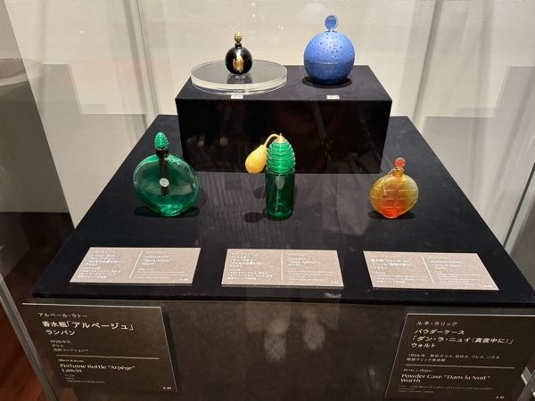 ドレスだけでなく、⾹⽔瓶や化粧道具、時計やジュエリーなどの⼩物も多数展⽰されています。アール・デコ期の洗練されたデザインが、⼥性の⽇常⽣活やモード⽂化にどう浸透していたかを感じられます。細部にまでこだわった装飾や幾何学模様は、まさに「モードを楽しむ」という当時の精神そのものです。