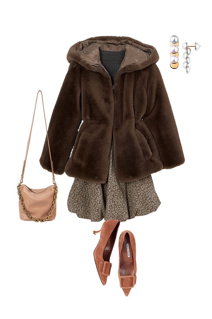 フード付きのフェイクファージャケットは内側のドローコードでウエストを絞れるエレ派仕様のデザイン。ピンクの小物で可憐に仕上げるのが正解。