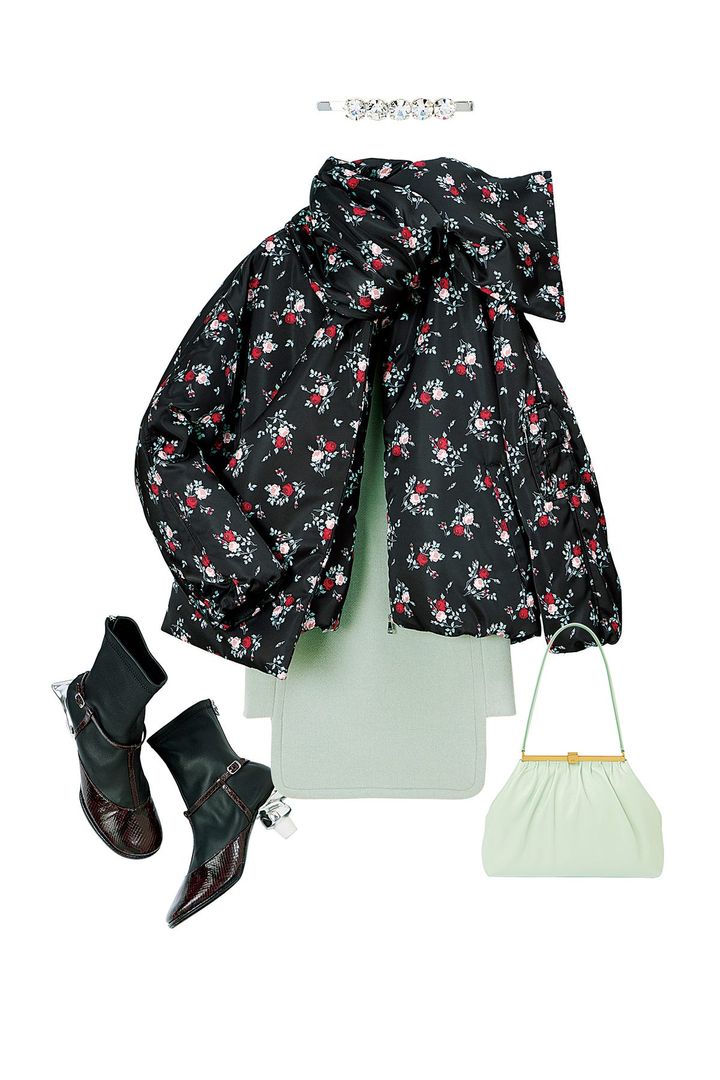 黒ベースの小花柄がシック&ガーリーな中綿ジャケットは、取り外し可能なストール付き。ミントグリーンのワンピとがま口バッグで上品な印象に。