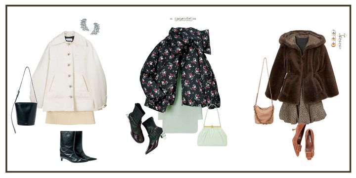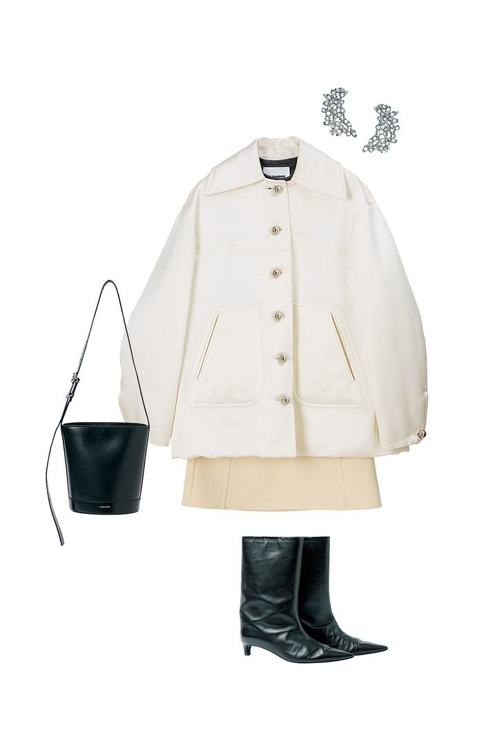 キルティング加工が施された上品な光沢のショート丈コートに、クリーム色のウールスカートをコーディネート。ブーツとバケツ型バッグの黒の小物が全体をシャープに引き締めます。